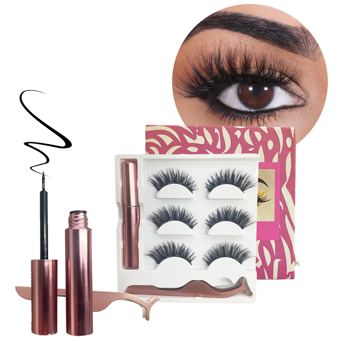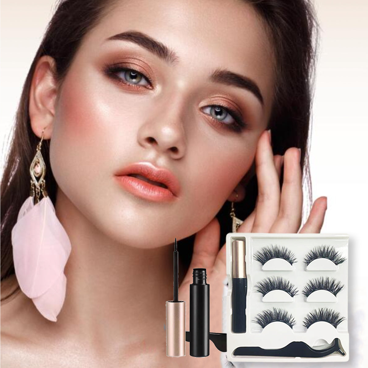 ¡Pestañas perfectas todo el tiempo! Nuestras pestañas cuentan con un delineador con con partículas imantadas que al entrar en contacto con las pestañas se adhieren de mejor que con el pegamento tradicional. En segundos tendrás una mirada deslumbrante.
